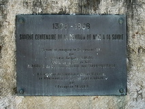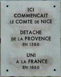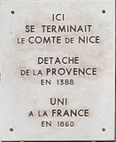 LA STELE« 1388-1988 - Monument inauguré le 20 janvier 1989 par Monsieur Jacques MEDECIN, MAIRE de la Ville de NICE, PRESIDENT du CONSEIL GENERAL DES ALPES MARITIMES - A l'initiative de l'Institut d'Etudes Niçoises, ce monument a été réalisé gracieusement par l'Entreprise TRIVERIO »
